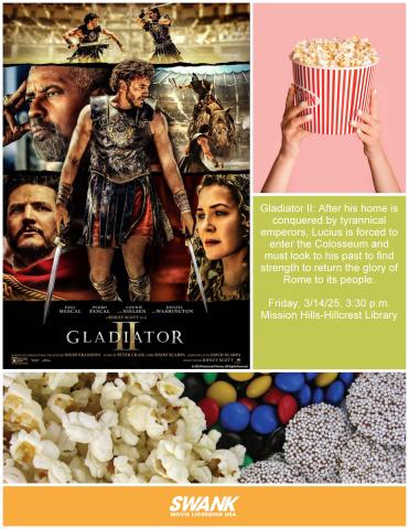 Join us for a free showing of Gladiator II on the big screen in the Community Room. After his home is conquered by the tyrannical emperors who now lead Rome, Lucius is forced to enter the Colosseum and must look to his past to find strength to return the glory of Rome to its people.