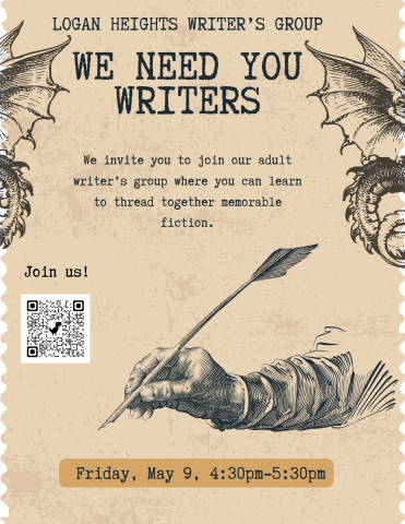 We need you writers! We invite you to join our adult writer's group where you can learn to thread together memorable fiction. To learn more please call at 619-533-3968 or email:Echavez@sandiego.gov