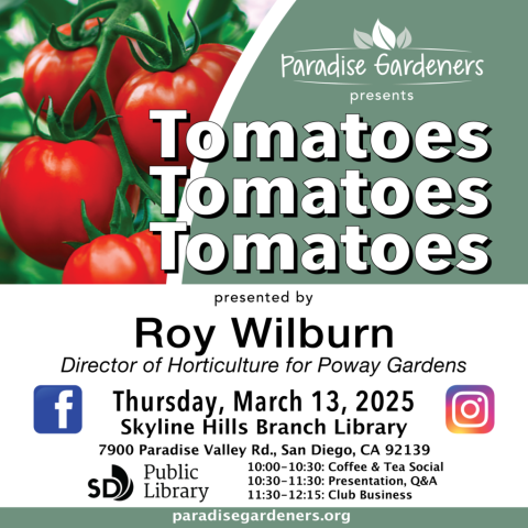 Our presenter will be Farmer Roy (Roy Wilburn) - Director of Horticulture for Poway Gardens