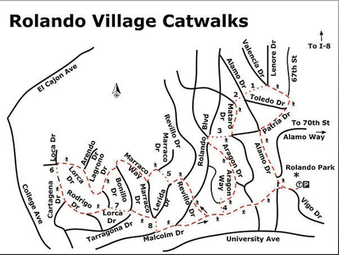 Each meeting we will walk part of the Rolando Village Catwalks (approx. 0.6 mile walk from the Library). We will not be able to walk the entire trail!
