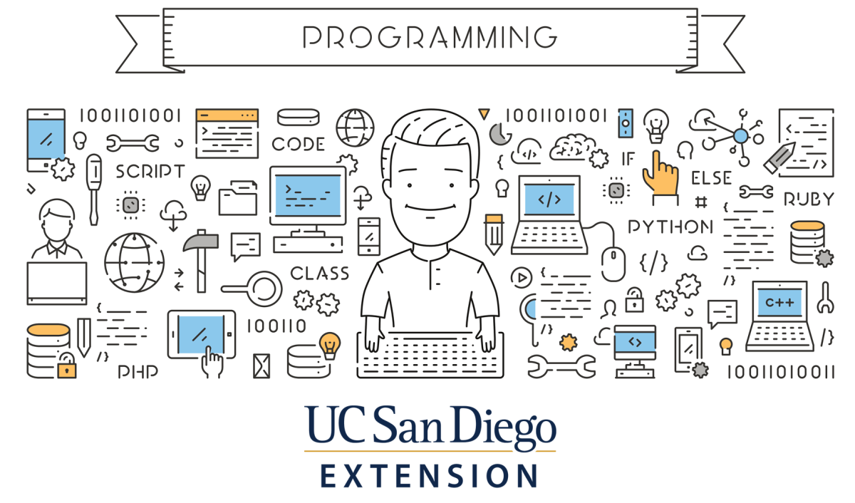 Illustration of a person sitting in front of a computer surrounded by programming symbols