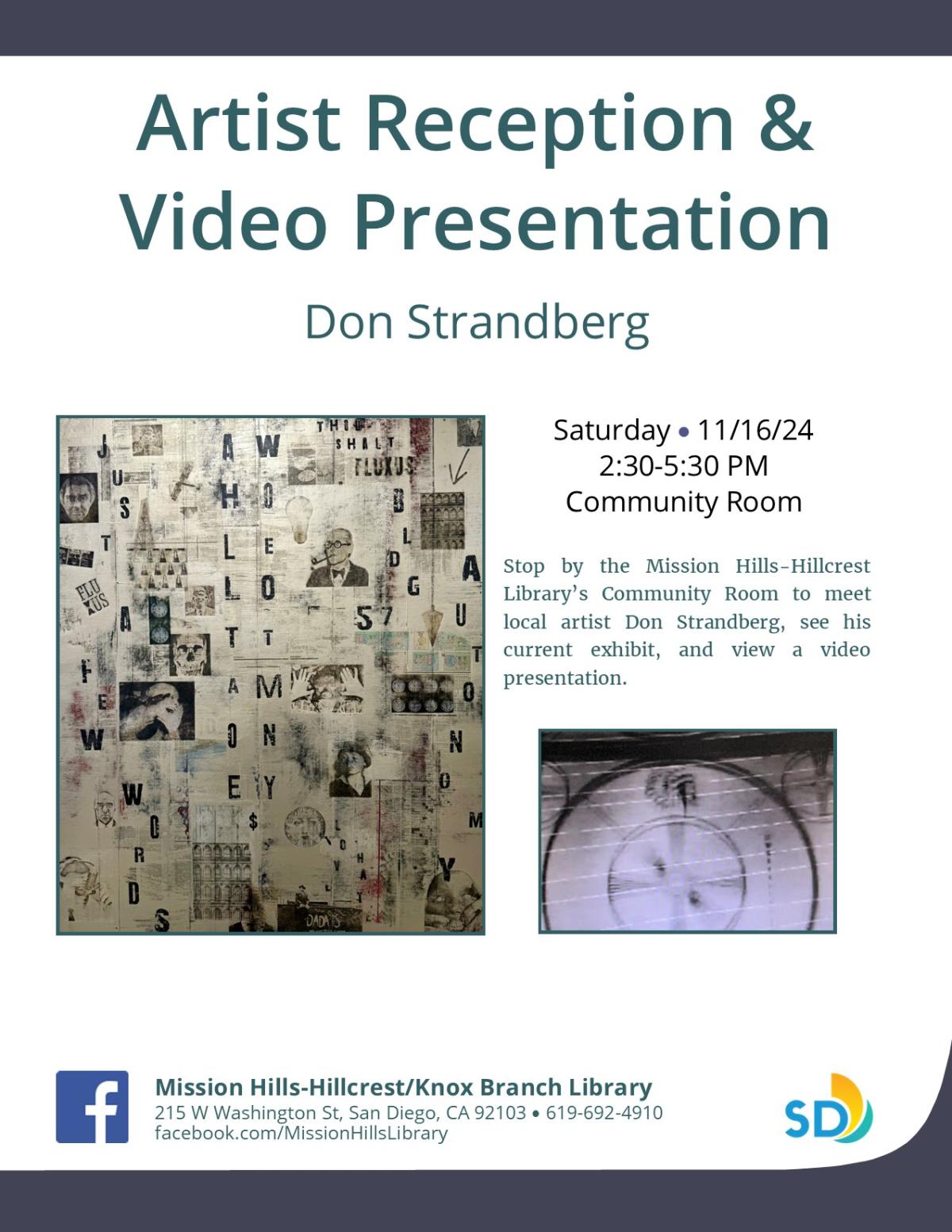 Flyer with details of event and photos of an abstract artwork and a video screen