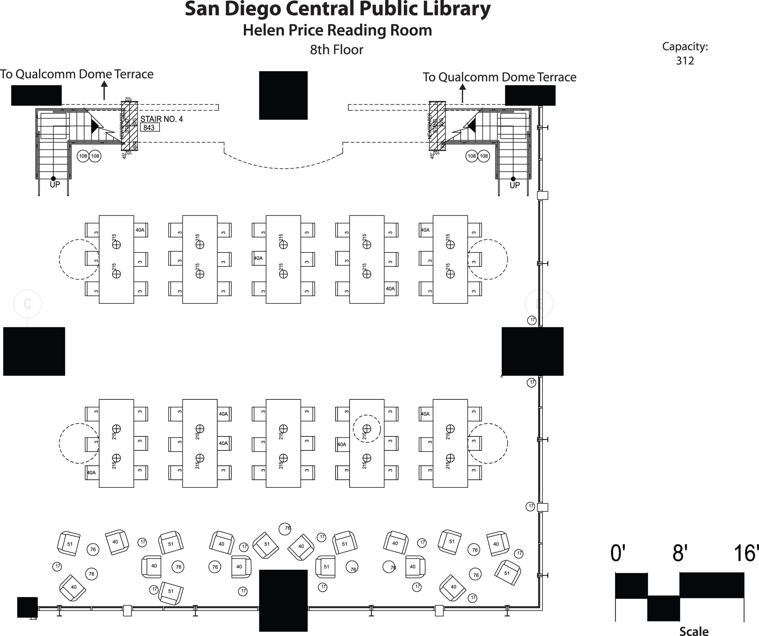 Reserve by Room Toggle Filters Room Type AnyCentral EventsCommunity RoomMeeting RoomSeminar Room Library Branch All BranchesSDPL Virtual BranchCentral LibraryAllied Gardens/Benjamin LibraryBalboa LibraryCarmel Mountain Ranch LibraryCarmel Valley LibraryCity Heights/Weingart LibraryCity Heights Performance AnnexClairemont LibraryCollege-Rolando LibraryKensington-Normal Heights LibraryLa Jolla/Riford LibraryLinda Vista LibraryLogan Heights LibraryMira Mesa LibraryMission Hills-Hillcrest/Knox LibraryMission Valley LibraryMountain View/Beckwourth LibraryNorth Clairemont LibraryNorth Park LibraryNorth University Community LibraryOak Park LibraryOcean Beach LibraryOtay Mesa-Nestor LibraryPacific Beach/Taylor LibraryPacific Highlands Ranch LibraryParadise Hills LibraryPoint Loma/Hervey LibraryRancho Bernardo LibraryRancho Peñasquitos LibrarySan Carlos LibrarySan Ysidro LibraryScripps Miramar Ranch LibrarySerra Mesa-Kearny Mesa LibrarySkyline Hills LibraryTierrasanta LibraryUniversity Community LibraryUniversity Heights LibraryValencia Park/Malcolm X LibraryOutreach Central Library AC - Courtyard (1st Floor) - Central Central Library Maximum Capacity: 500 Outdoor space near the parking elevator, lobby, and Library Shop. Entrance leads to 11th Ave.Location: 1st FloorSquare Footage: 7,007This space must be requested at least 30 days prior to the event date.A minimum rental rate of eight hours will be charged for this rental space. Each additional hour, including load in and load out time, will be charged the hourly rate. Additional ancillary fees based on the Library's current fee structure may be charged depending on the event to recover after hours expenses or costs for additional staffing, security, audio visual needs or cleaning.Renters are required to use a caterer from the Library’s Exclusive Caterers list.Documents: Special Event Space Rental FeesSpecial Event Ancillary Fees Room Details AC - Helen Price Reading Room - Central Central Library Maximum Capacity: 264 Public space during Central Library open hours. Only available for rental outside Central Library open hours.Location: 8th FloorSquare Footage: 2,000Check out a Google360 view of the room here.Price Reading Room layout map here.Special events spaces must be requested at least 60 days prior to the event date.A minimum rental rate of eight hours will be charged for this rental space. Each additional hour, including load in and load out time, will be charged the hourly rate. Daily (eight hour) rental rates are used as a point of comparison only. Event space may not be available for all day rental. Additional ancillary fees based on the Library's current fee structure may be charged depending on the event to recover after hours expenses or costs for additional staffing, security, audio visual needs or cleaning.Renters are required to use a caterer from the Library’s Exclusive Caterers list.Documents:Room Rental ApplicationSpecial Event Space Rental FeesSpecial Event Ancillary Fees Room Details AC - Jaffe Mountain View Reading Room (5th Floor) - Central Central Library Maximum Capacity: 75 This medium sized meeting space overlooks the Library Courtyard and Park Blvd. It is located on the 5th floor near the Outdoor Rock Garden.Location: 5th FloorSquare Footage: 1024 sq ft.75 Persons standing capacity. This space must be requested at least 30 days prior to the event date.A minimum rental rate of eight hours will be charged for this rental space. Each additional hour, including load in and load out time, will be charged the hourly rate. Additional ancillary fees based on the Library's current fee structure may be charged depending on the event to recover after hours expenses or costs for additional staffing, security, audio visual needs or cleaning.Renters are required to use a caterer from the Library’s Exclusive Caterers list.Documents: Room Rental ApplicationSpecial Event Space Rental FeesSpecial Event Ancillary Fees Room Details AC - Mary Hollis Clark Conference Center - Central Central Library Maximum Capacity: 40 Flexible meeting space located in the lobby area near the parking elevator, courtyard, and Library Shop.Location: 1st FloorSquare Footage: 688For a layout of the space please click HereThis space must be requested at least 30 days prior to the event date.A minimum rental rate of eight hours will be charged for this rental space. Each additional hour, including load in and load out time, will be charged the hourly rate. Additional ancillary fees based on the Library's current fee structure may be charged depending on the event to recover after hours expenses or costs for additional staffing, security, audio visual needs or cleaning.Renters are required to use a caterer from the Library’s Exclusive Caterers list.Documents: Room Rental ApplicationSpecial Event Space Rental FeesSpecial Event Ancillary Fees Room Details AC - Meeting Room 221 - Central Central Library Maximum Capacity: 9 This room is available at no charge to all public, private, profit and non-profit groups, regardless of their beliefs or affiliations. Granting permission to use library facilities does not constitute endorsement by the San Diego Public Library, the Board of Library Commissioners, or the City of San Diego. No advertisement or announcement implying such endorsement is permitted, unless written permission to do so has been previously given by the Library. This room is defined as a space within the library facility that is designated for group meetings. Study Rooms and Special Event Spaces are separate spaces and have different policies for their use.This room must be requested at least two weeks prior to the requested date.Each group may schedule one meeting per month with a maximum 4-hour limit.Groups may not schedule events earlier than three months in advance of the event.Any exceptions may be made at the discretion of the appropriate library staff.Food is not permitted in the room.Parking rates are subject to change during special even
